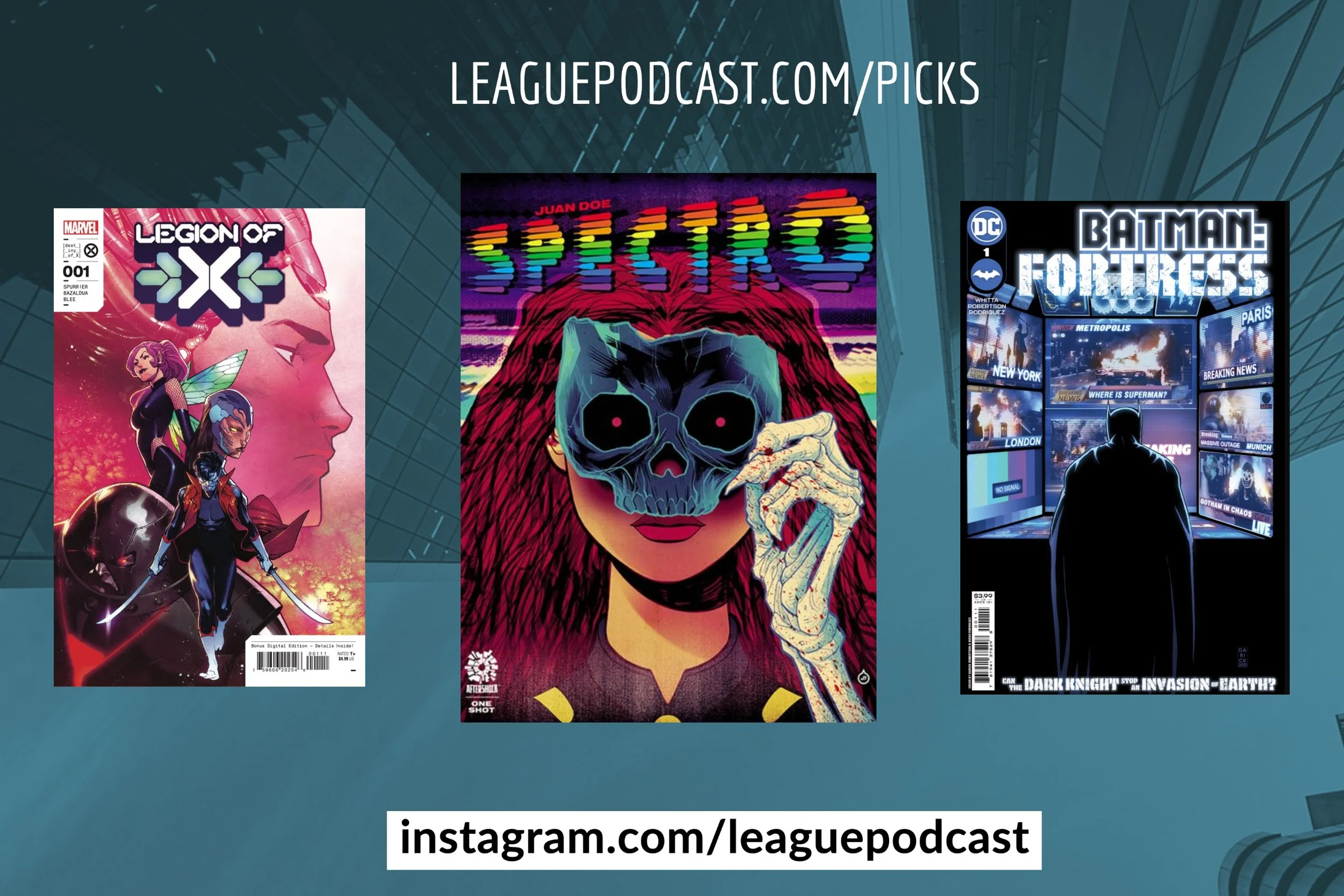 Krakoa must safeguard itself against those who would damage its peace or traumatize its people in Legion of X #1! ... Gary Whitta (Rogue One: A Star Wars Story ) and Darick Robertson (The Boys) stop by Gotham and Batman must solve an alien environmental threat in Batman Fortress #1! ... Aftershock Comics drops a four story horror anthology book from Juan Doe with Spectro #1! ... Picks this week from LeaguePodcast.com.